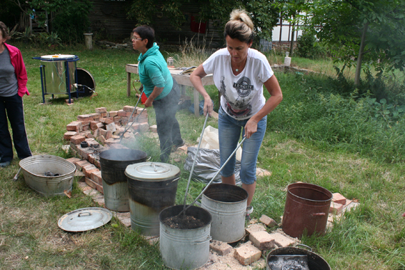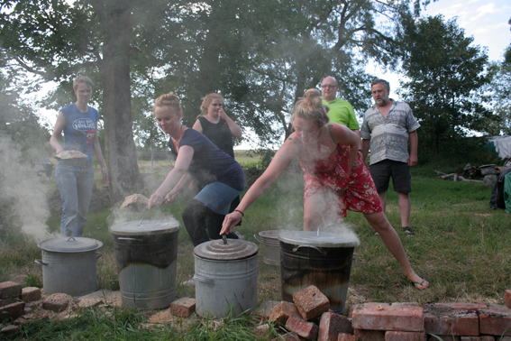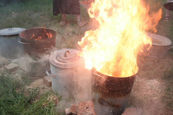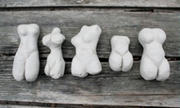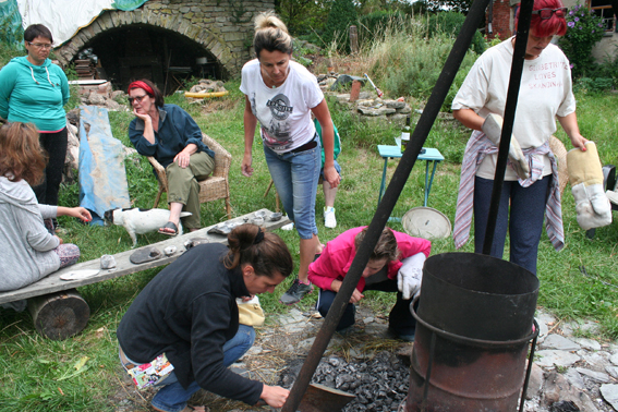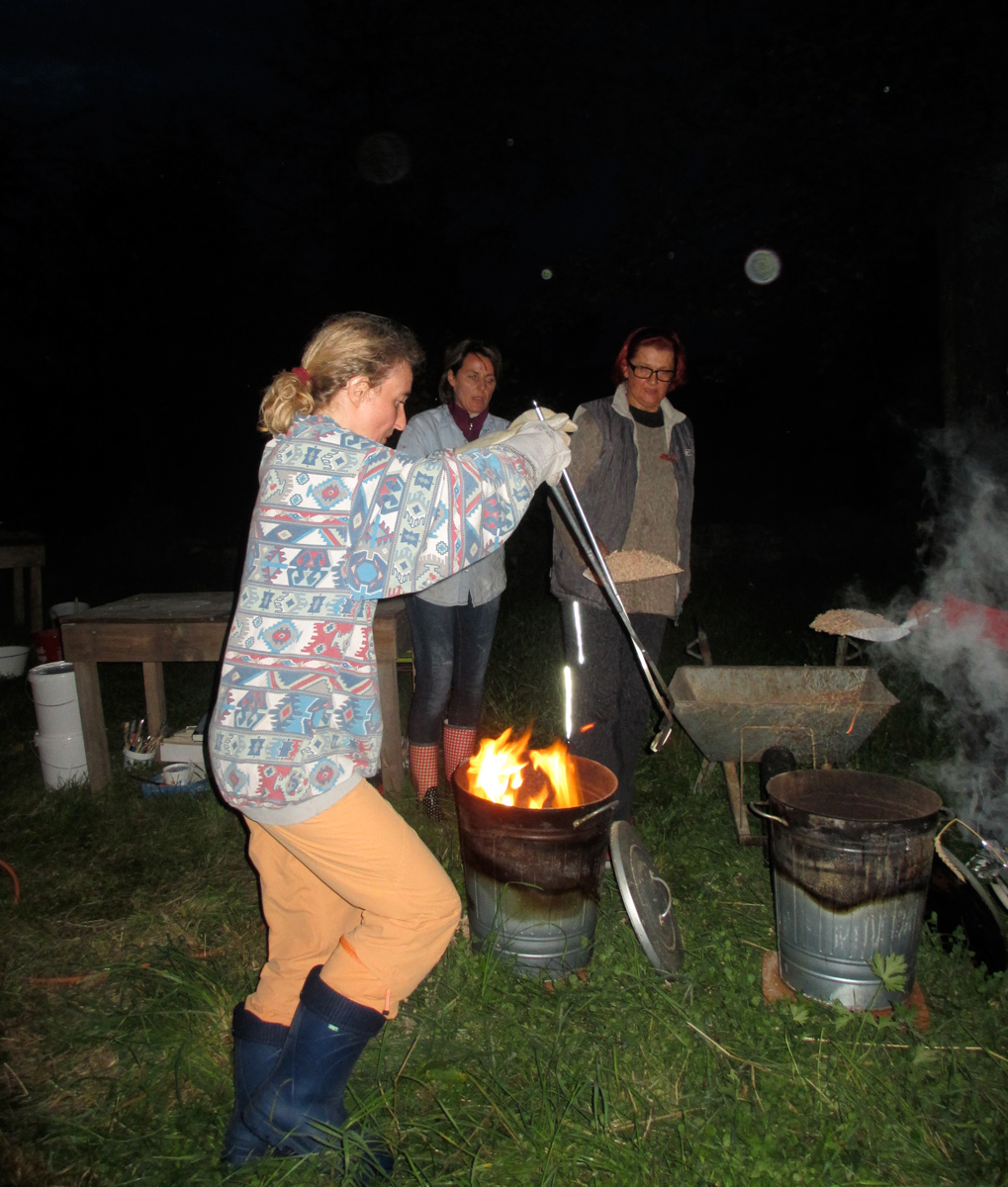 kleine Keramikbüsten kurz vorm Brand im Lagerfeuer